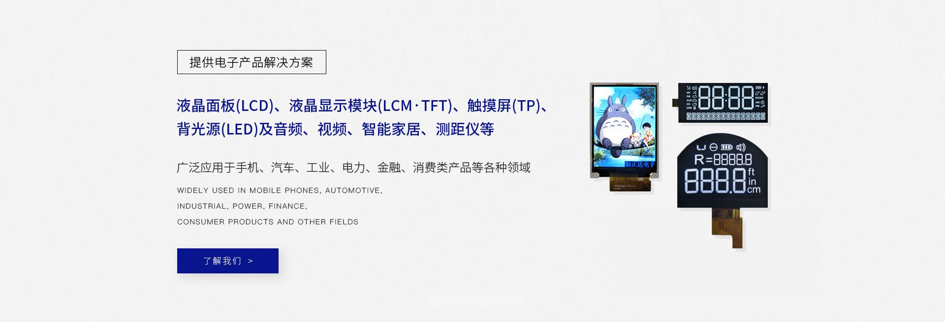 專業(yè)設(shè)計(jì)、生產(chǎn)液晶面板(LCD)、液晶顯示模塊(LCM·TFT)、觸摸屏(TP)、背光源(LED)及音頻、視頻、智能家居、測距儀等